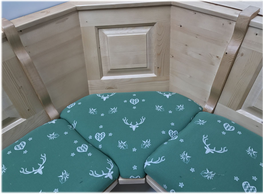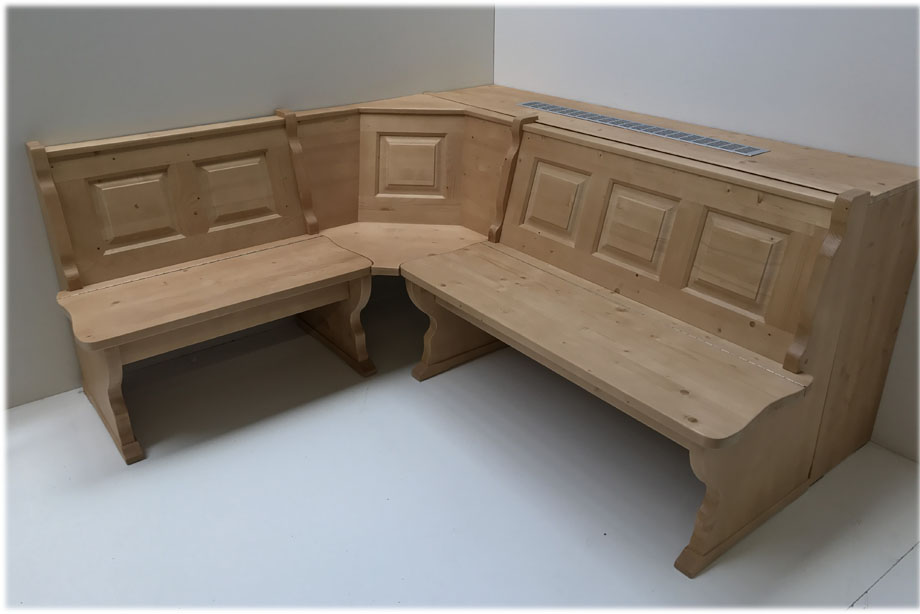 Eckbank 150/185 cm, Gesamthöhe 85 cm, mit Truhen wechselseitig stellbar Alles in Fichte massiv, Rosner gebeizt und gewachst