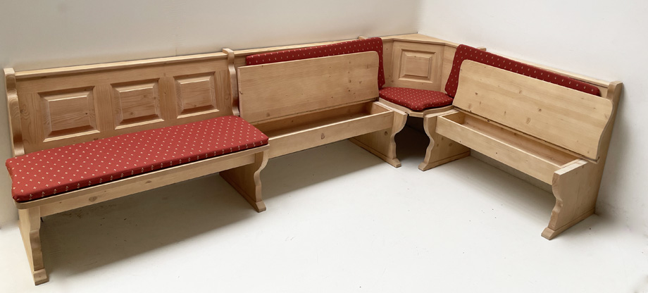 Eckbank System Amberg, 300/165 cm, mit Truhen, als Laufmeterbank mit gleichen Schenkeln, Innenwangen vorstehend , keine durchgehende Ablage !
