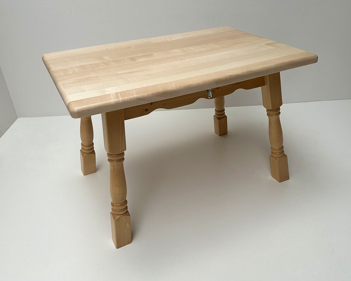 Gestell in Fichte massiv, Rosner gewachst, Ahornplatte 120/80 cm, 4 cm stark, Bio geölt
