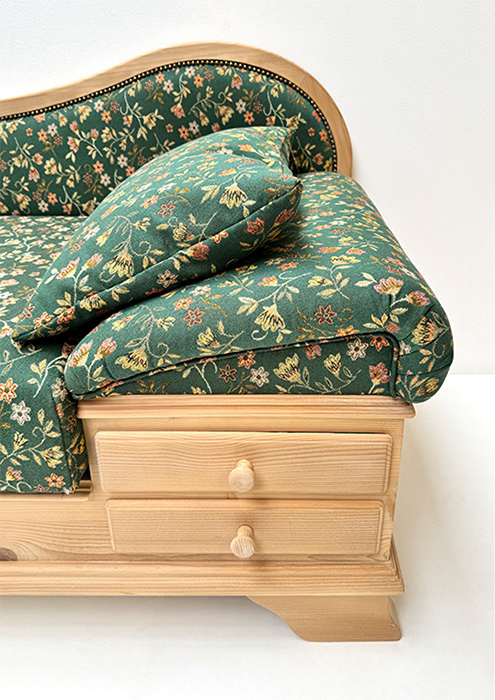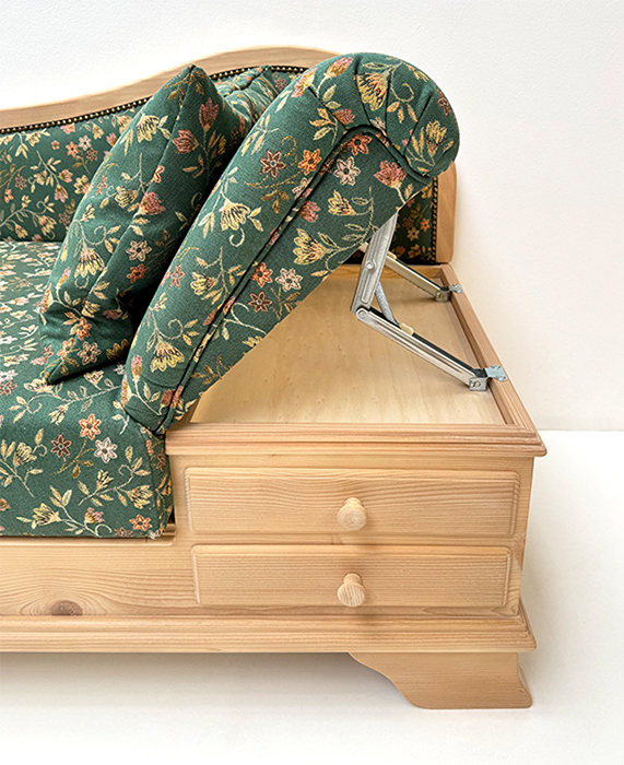 Liege Garmisch, Abm: 195/75/86 cm, (L/T/H), Sitzhöhe 45 cm, Polsterung Komfort Kaltschaum, Kopfteil höhenverstellbar, Sitz mit Klappfunktion, 2 große Schubladen, mit Holzknopf