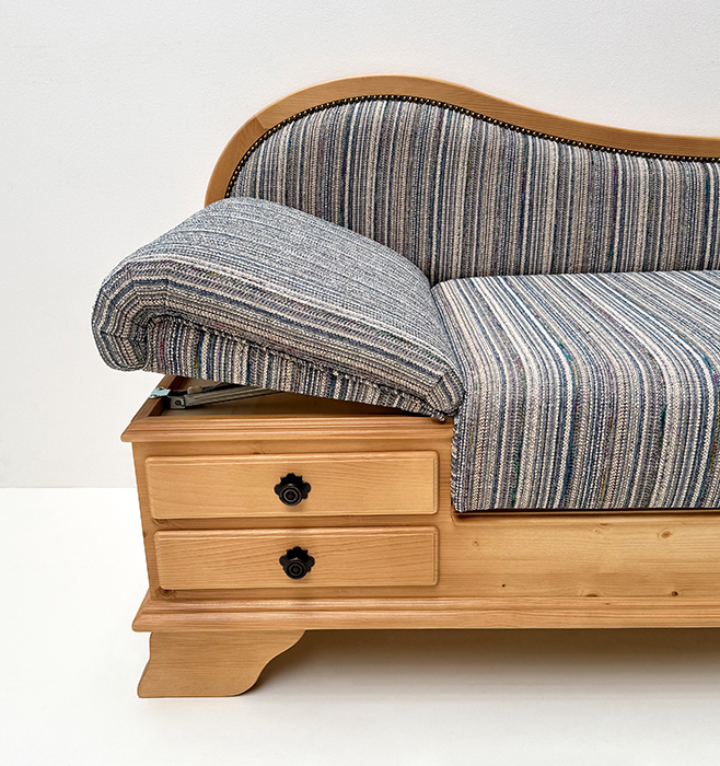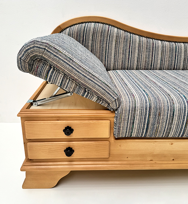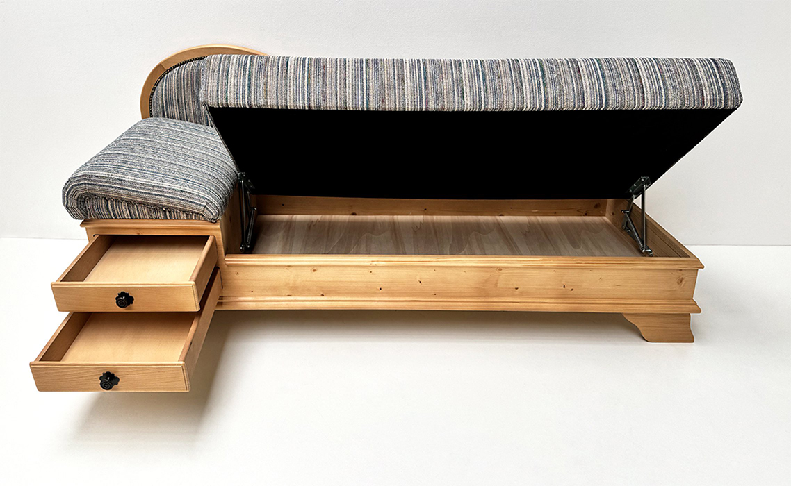 Sitz aufklappbar, Kopfteil im Raster verstellbar, 2 große Schubladen, inkl. 1 Kissen 40/60 cm, mit Federfüllung