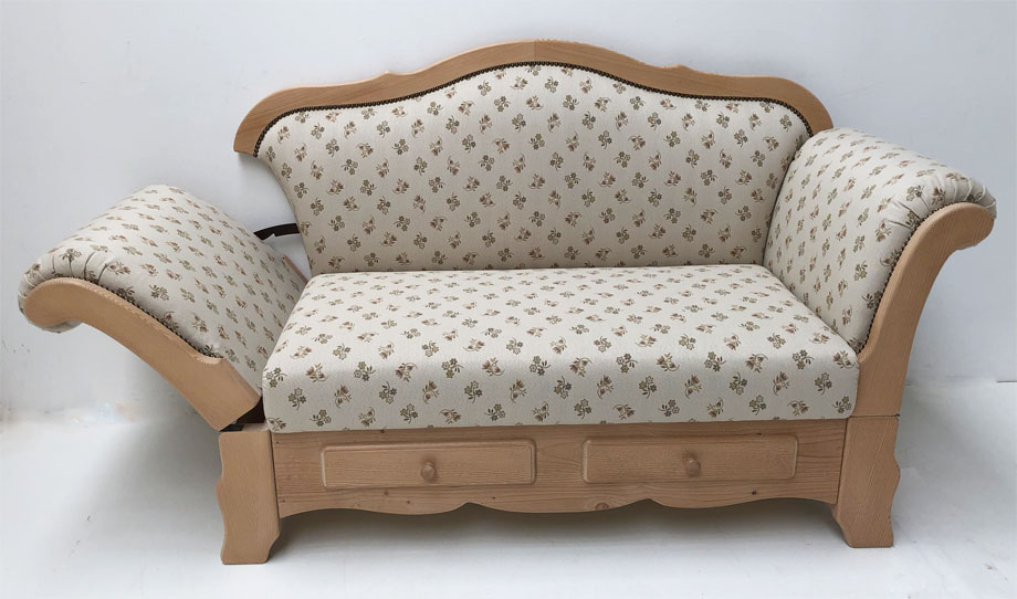 Holz Fichte massiv, Rosner gewachst, Angebotsstoffe: 1 Sofa Kempten ,Länge 160, Sitz 110 cm, Rücken Holzrahmen, Sitz aufklappbar, Schubladenblenden,