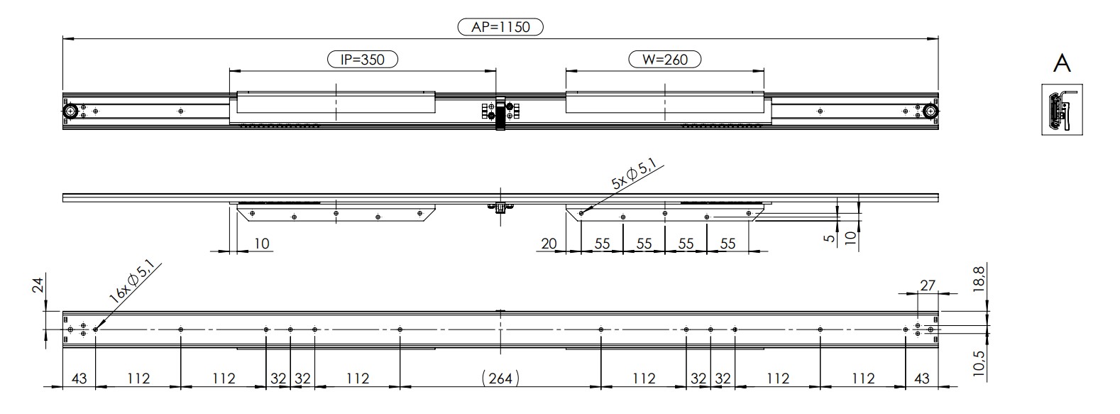 einfacher Tischauszug aus Metall für 2 Einlegeplatten max 80 cm, Einbaumaß 115 cm