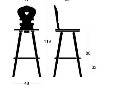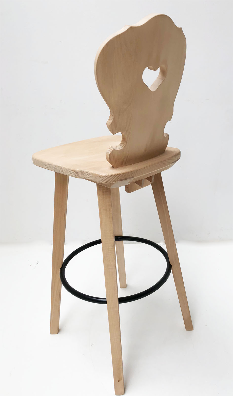 Abm. 48 x 52 x 119 cm, B/T/H , Sitzhöhe 80 cm, Sprossenhöhe Fußkranz Metall 33 cm, Lehne mit Herz, Fichte massiv, gewachst, SP5, Sitz mit gefräster Kehlung