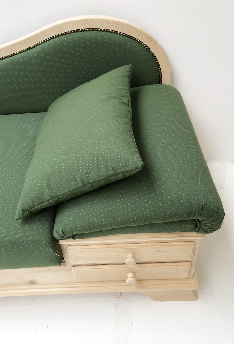 Abm: 195/76/79 cm, (L/T/H), Sitzhöhe 46 cm, Polsterung Komfort Kaltschaum,   Kopfteil höhenverstellbar, Sitz mit Klappfunktion, Holzteile: Fichte