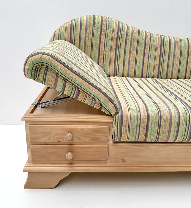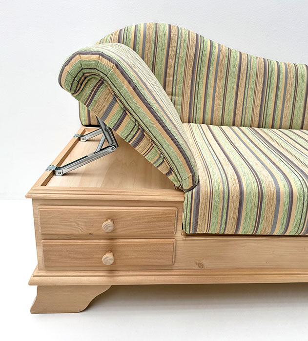 Abm: 195/75/86 cm, (L/T/H), Sitzhöhe 45 cm, Polsterung Komfort Kaltschaum, Kopfteil höhenverstellbar, Sitz mit Klappfunktion, Holzteile: Fichte , Stoffgruppe 1, im Bild Edmonton grün, Angebotsstoff: 100% Polyester, 18.000 Scheuertouren, lfm Stoff 140 cm Breite,