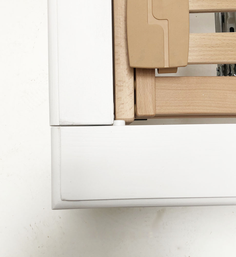 Bett 140/200 cm, niedriges Fußteil, hohes Kopfteil, Kiefer massiv, Deckend weiß P004 lackiert