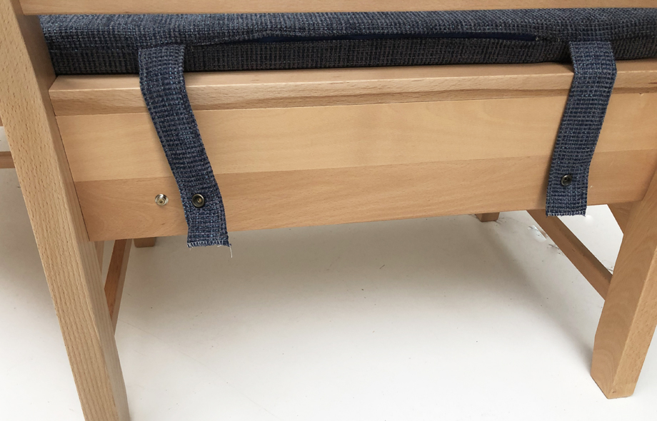 1 Kissensatz lose genäht mit Reissverschluß zum Abziehen, Laschen mit Wendedruckknopf zum Fixieren, Gegen Verrutschen mit Antirutschunterlage !