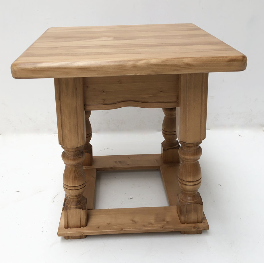 Abm. 60/60 cm, Höhe 64 cm, Gestell mit Fussrahmen, Fichte massiv, Platte 4 cm stark, Anti hell gebeizt und lackiert