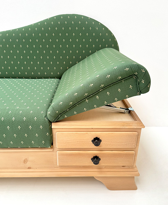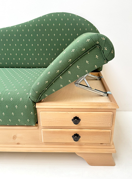Sonderlänge 220 cm, Sitzhöhe 46 cm , Sitz aufklappbar, Kopfteil im Raster verstellbar, 2 große Schubladen, inkl. 1 Kissen 40/60 cm, mit Federfüllung