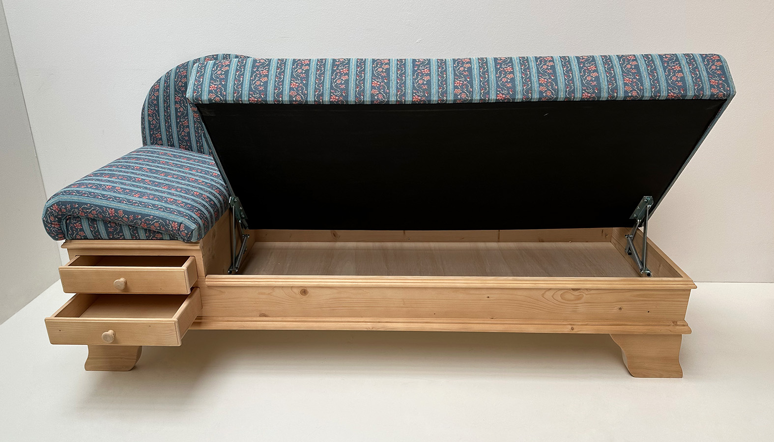 Abm: 195/75/86 cm, (L/T/H), Sitzhöhe 45 cm, Polsterung Komfort Kaltschaum, Kopfteil höhenverstellbar, Sitz mit Klappfunktion, Holzteile: Fichte, gewachst