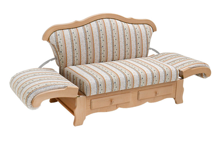Rücken Holzrahmen, Sitz aufklappbar, Schubladenblenden vorne,