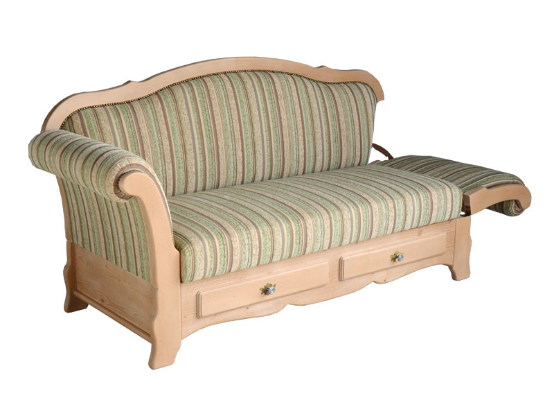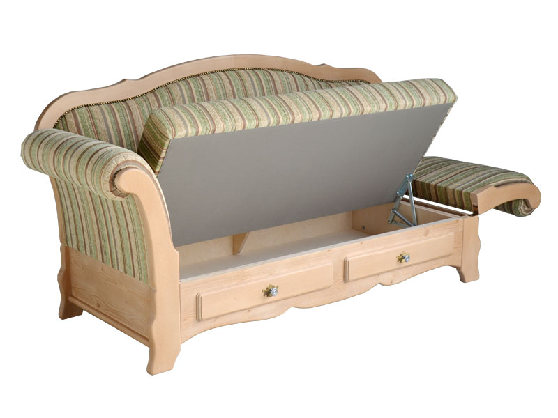 Rücken Holzrahmen, Sitz aufklappbar, Schubladenblenden vorne