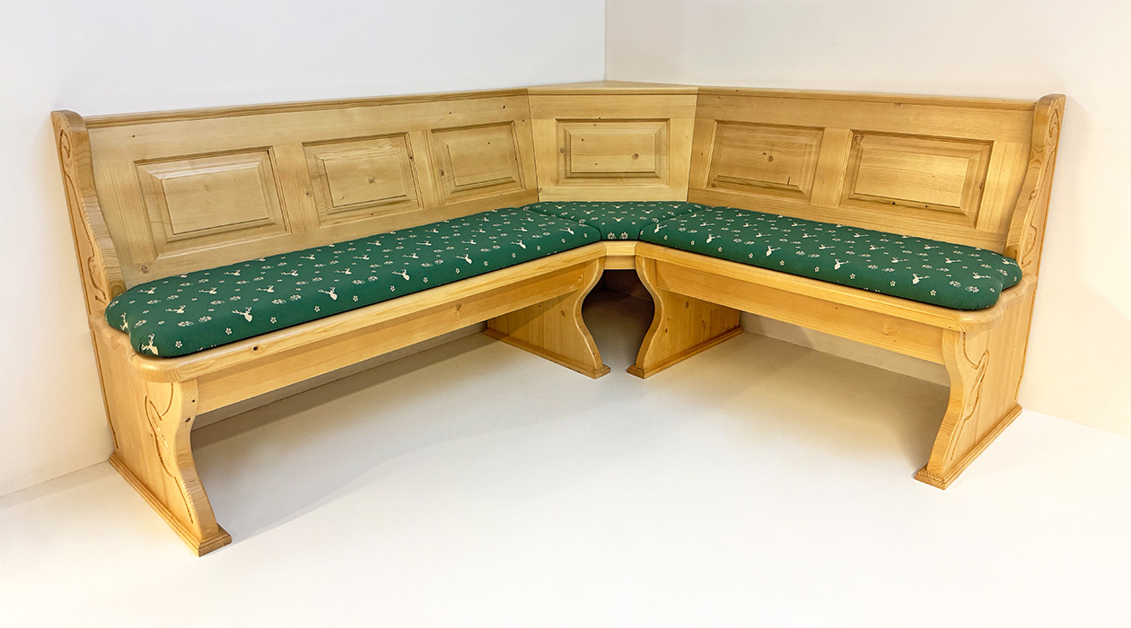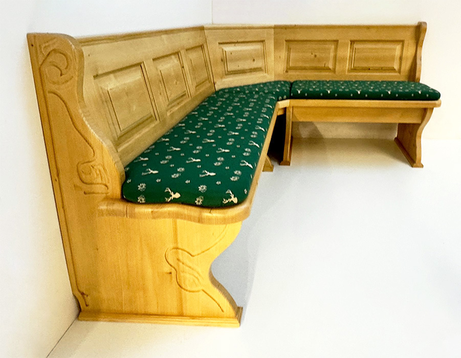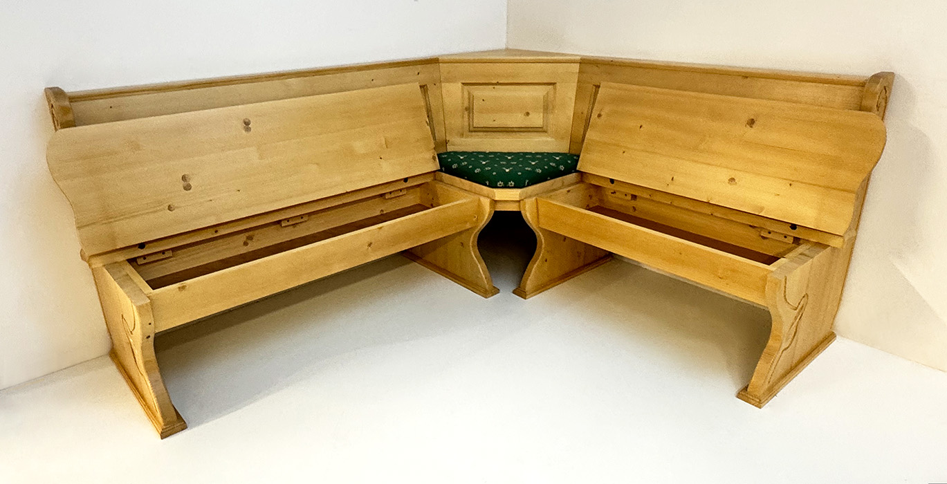 1 Eckbank Lindau, Schenkelmaß 195/165 cm, mit Truhen, Außenwangen geschnitzt, Wangenhöhe 89 cm, Ablagenhöhe 87 cm, Standard Ablagenbreite 6 cm
