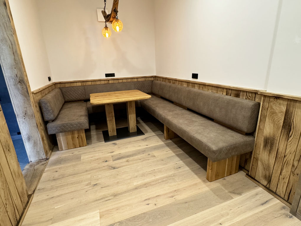 U-Bank, Eckbank U-Form, Modell GRACE, Serie Naturnah Möbel, Schenkelmaß 146/236/300 cm, Wildeiche lackiert, Bezug Toffee 9120