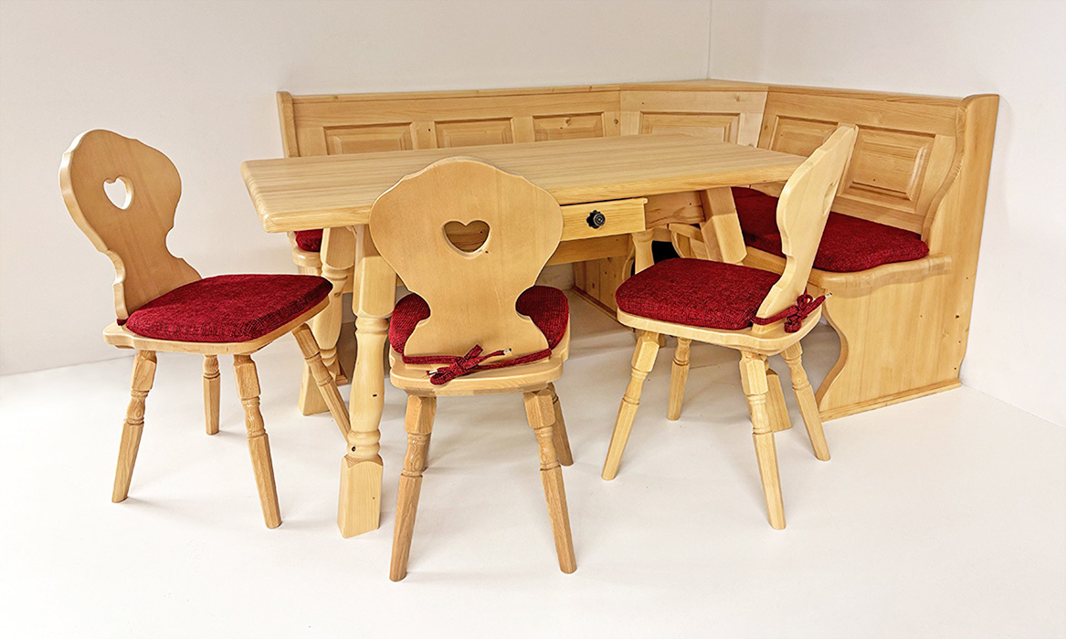 Eckbankgruppe LINDAU 150/185 Fichte, Tisch 4510-Amberg, Bauernstuhl Munich, Armlehnstuhl Munich