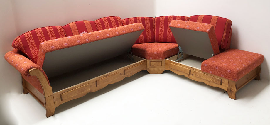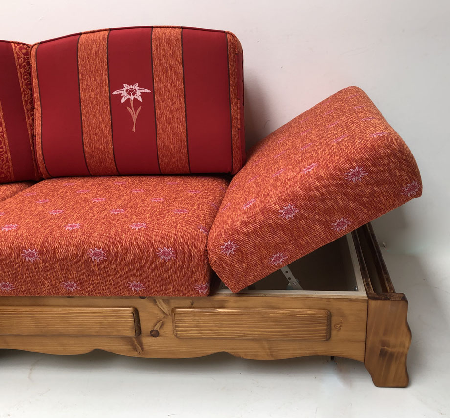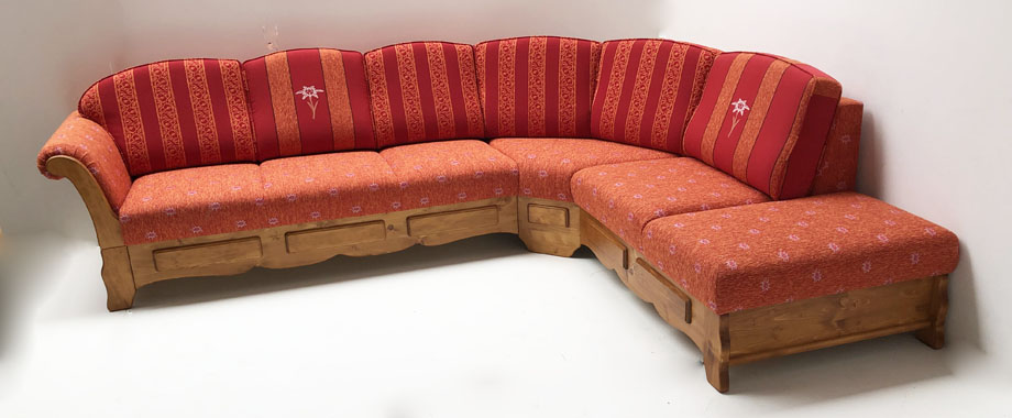 Schenkel links: Sitze und Armlehne Perle Brosche 50,, Rückenkissen 1 Stoff Alphorn 50, Rückenkissen 2 Stoff Bergedelweiss 50, Rückenkissen 3 Alphorn 50