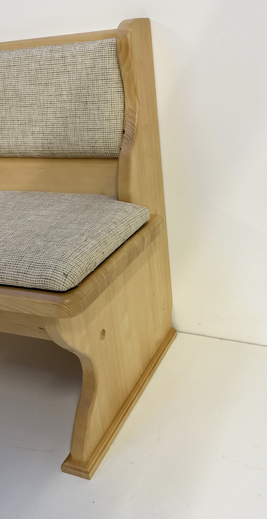 Einzelbank Lindau, Fichte massiv, Rosner Hartwachs, Länge 120 cm, Sitzabschluss gerade, Aussenwangen glatt, Rücken Vollpolster flächig, mit