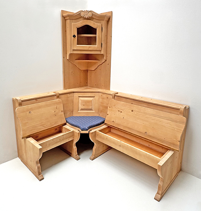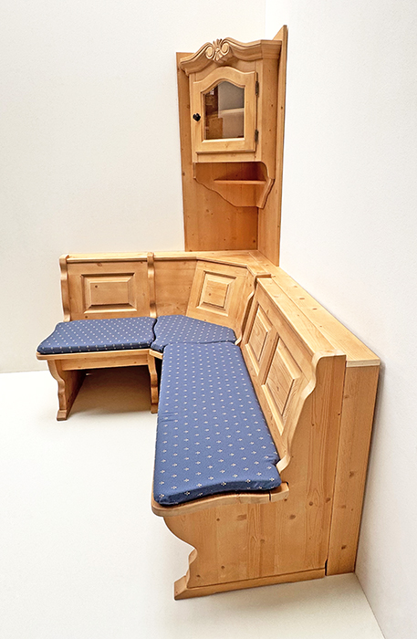 1 Eckbank 125/165 cm mit Truhen, Gesamthöhe 85 cm, wechselseitig stellbar; alles in Fichte massiv, Rosner gewachst