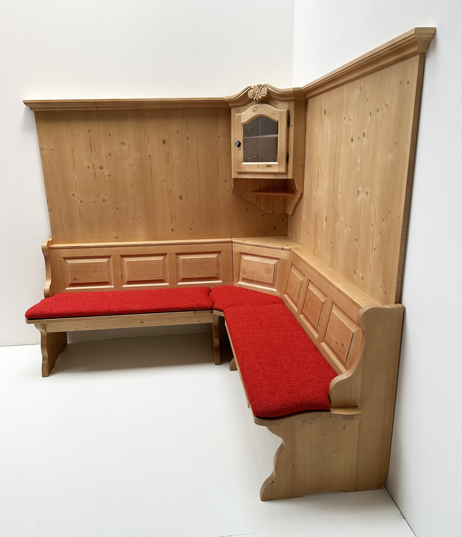 Eckbank Landau solo 195/195 cm mit Truhen aufklappbar, Wandverkleidung und Eckhänger geschnitzt