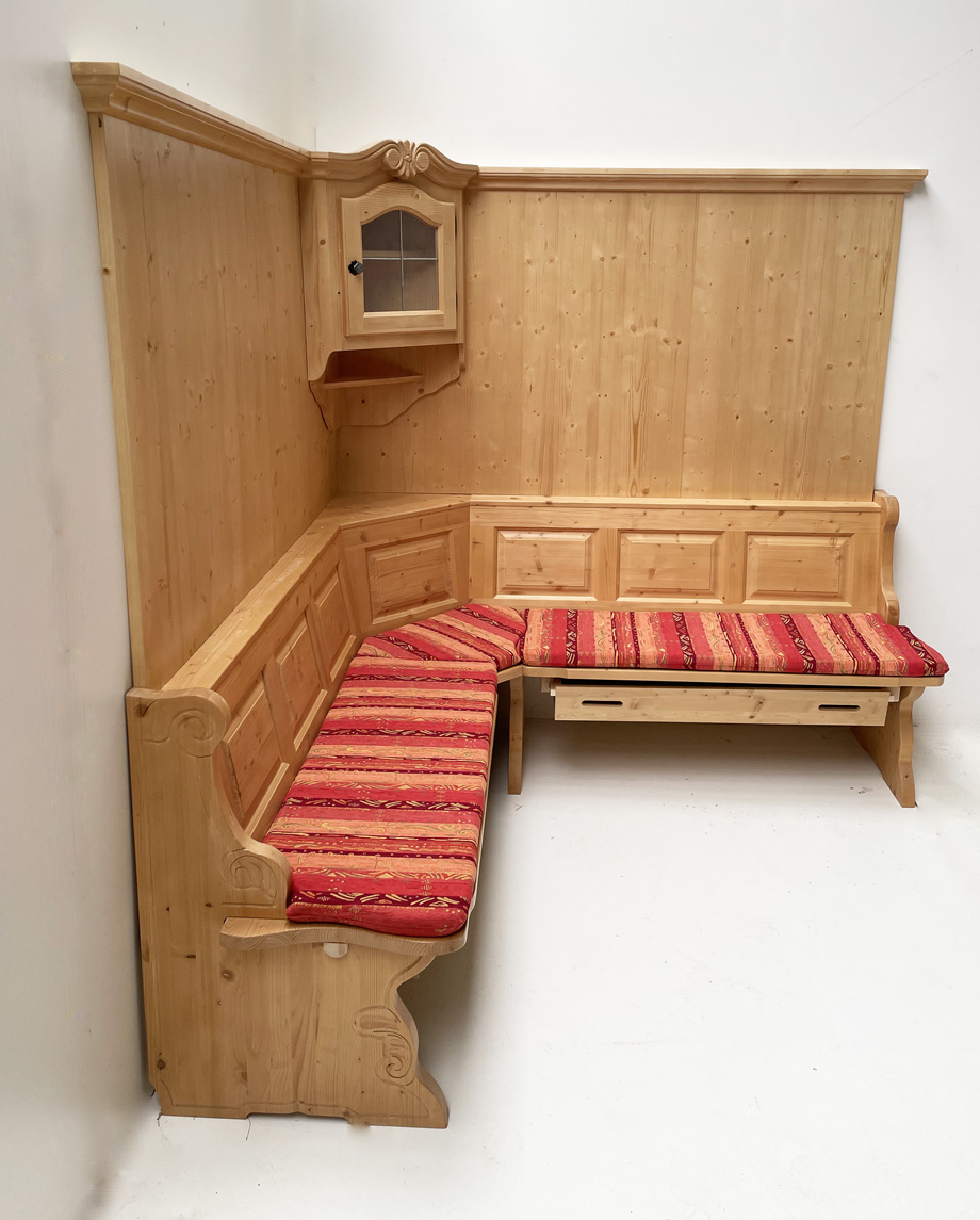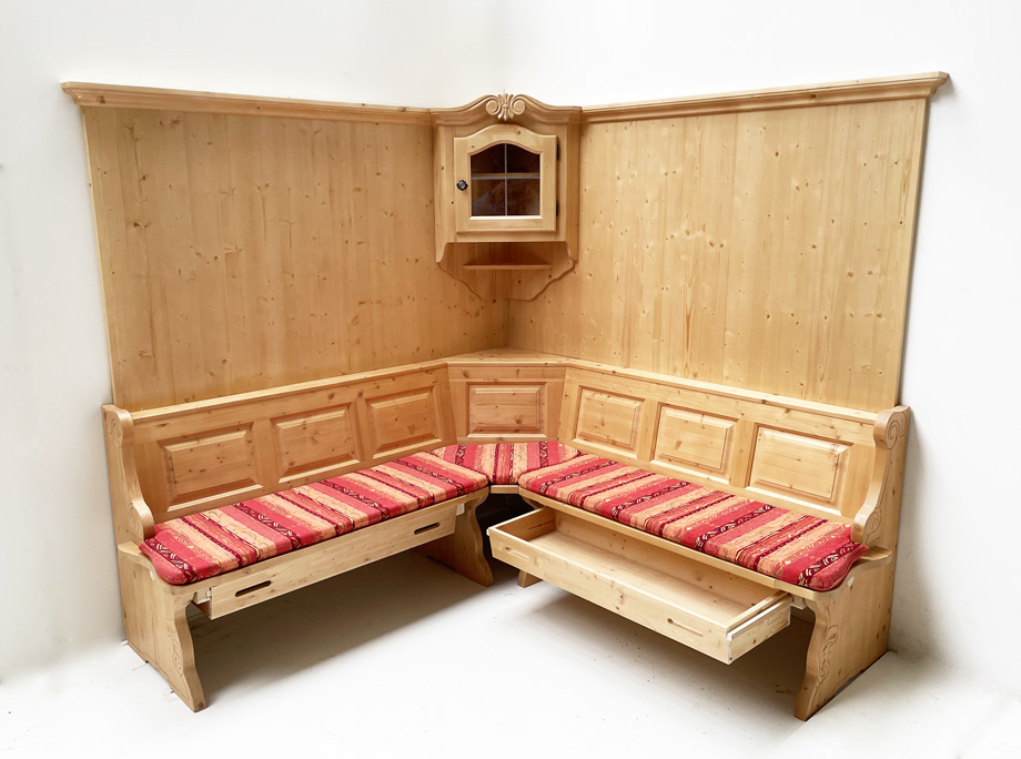 Eckbank Landau solo 195/195 cm mit Truhen aufklappbar, Wandverkleidung und Eckhänger geschnitzt