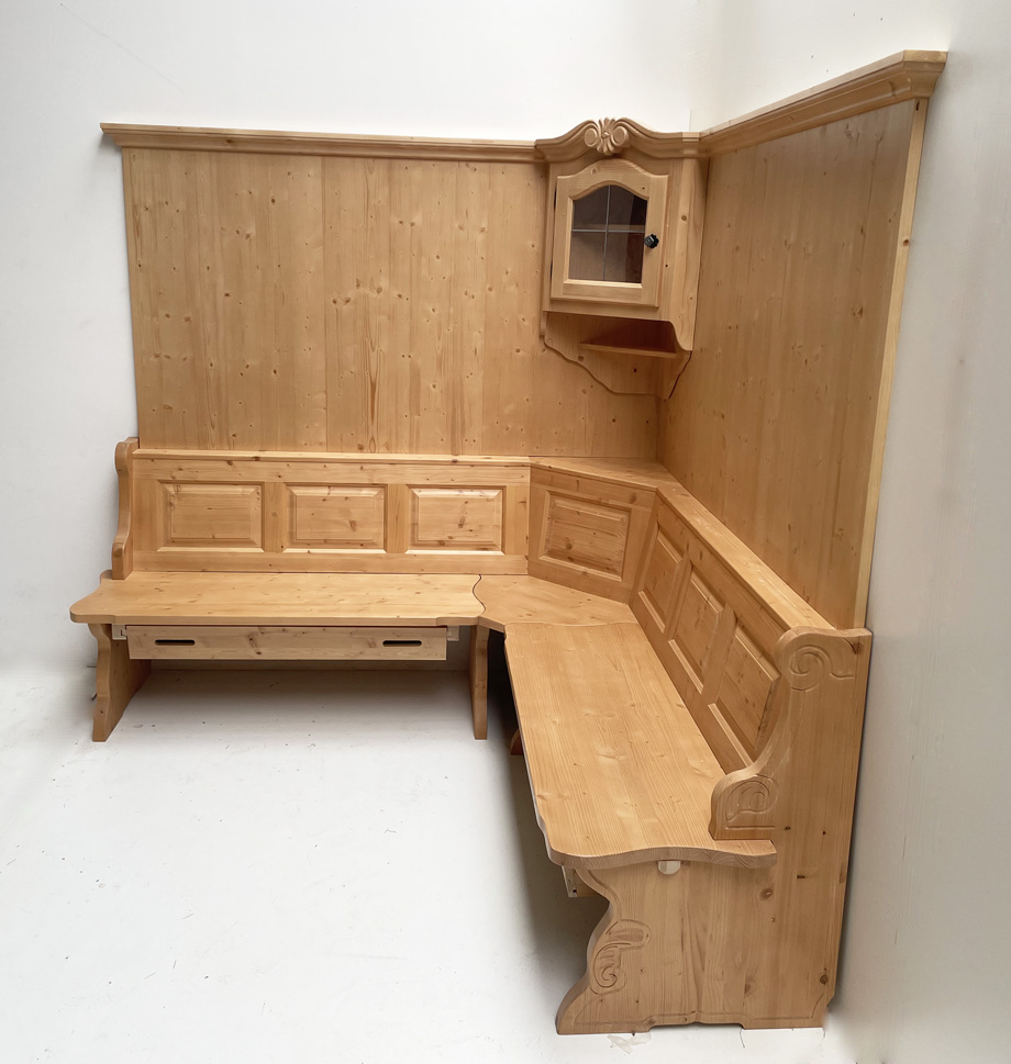 Eckbank Landau solo 195/195 cm mit Truhen aufklappbar, Wandverkleidung und Eckhänger geschnitzt