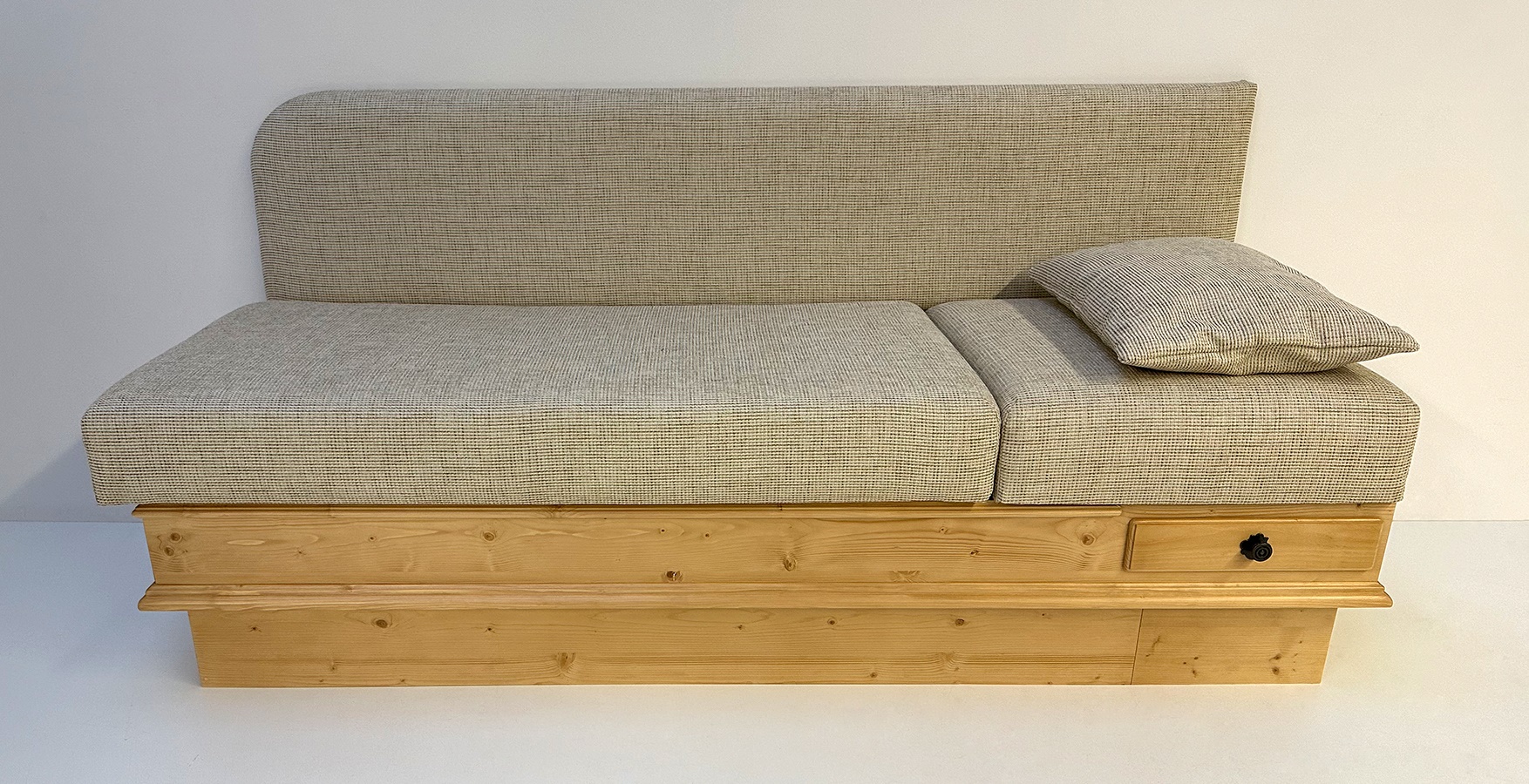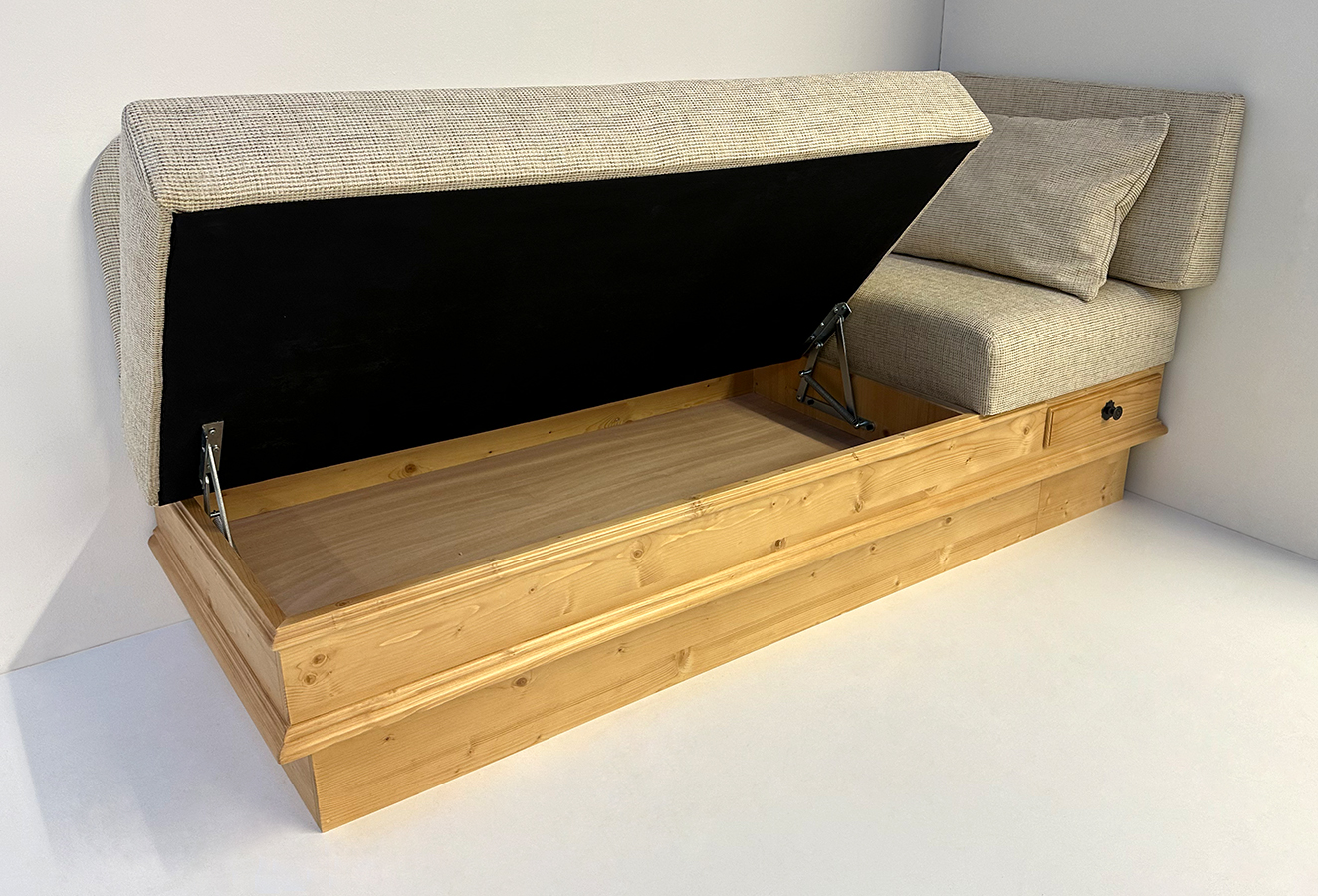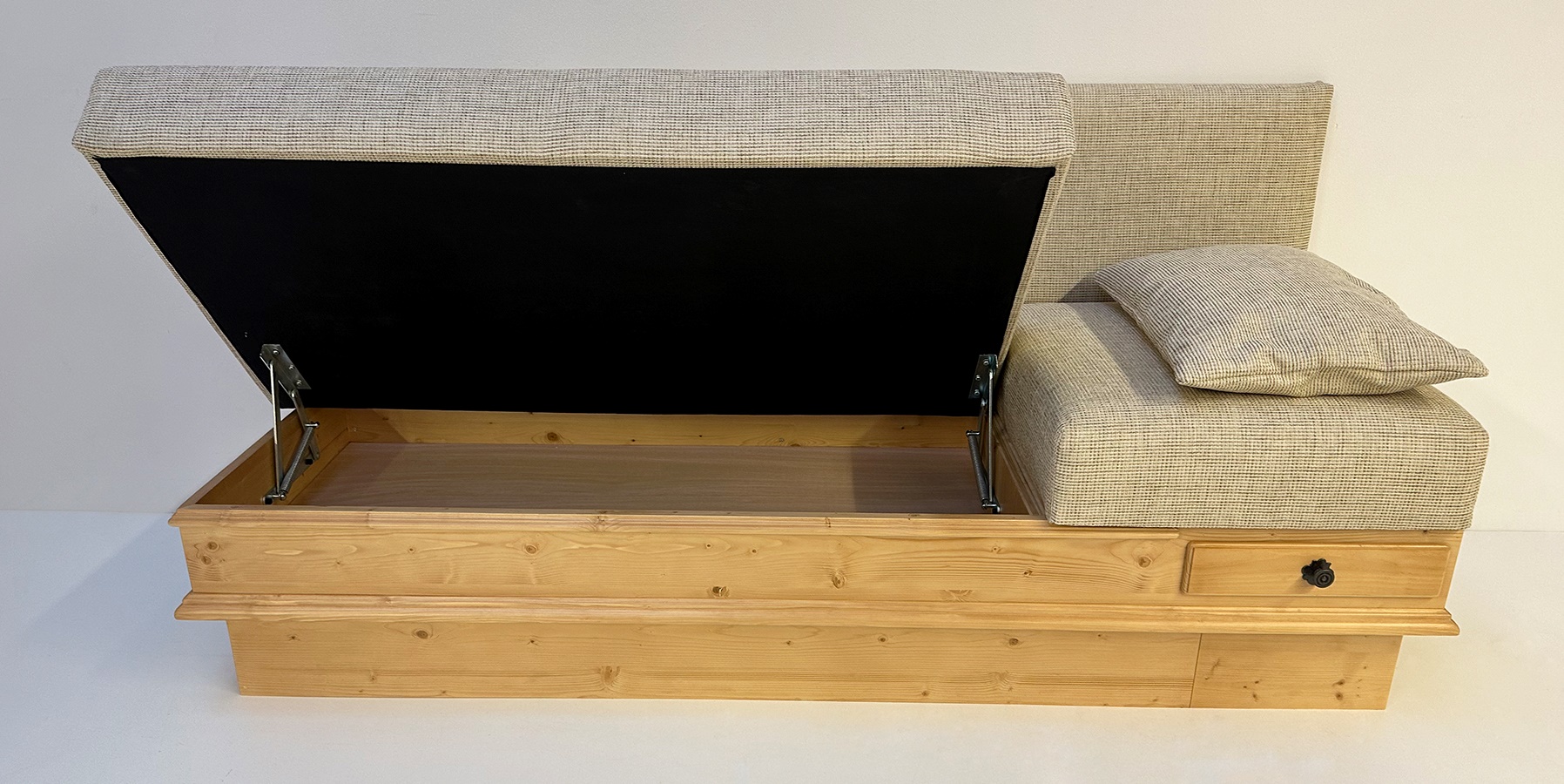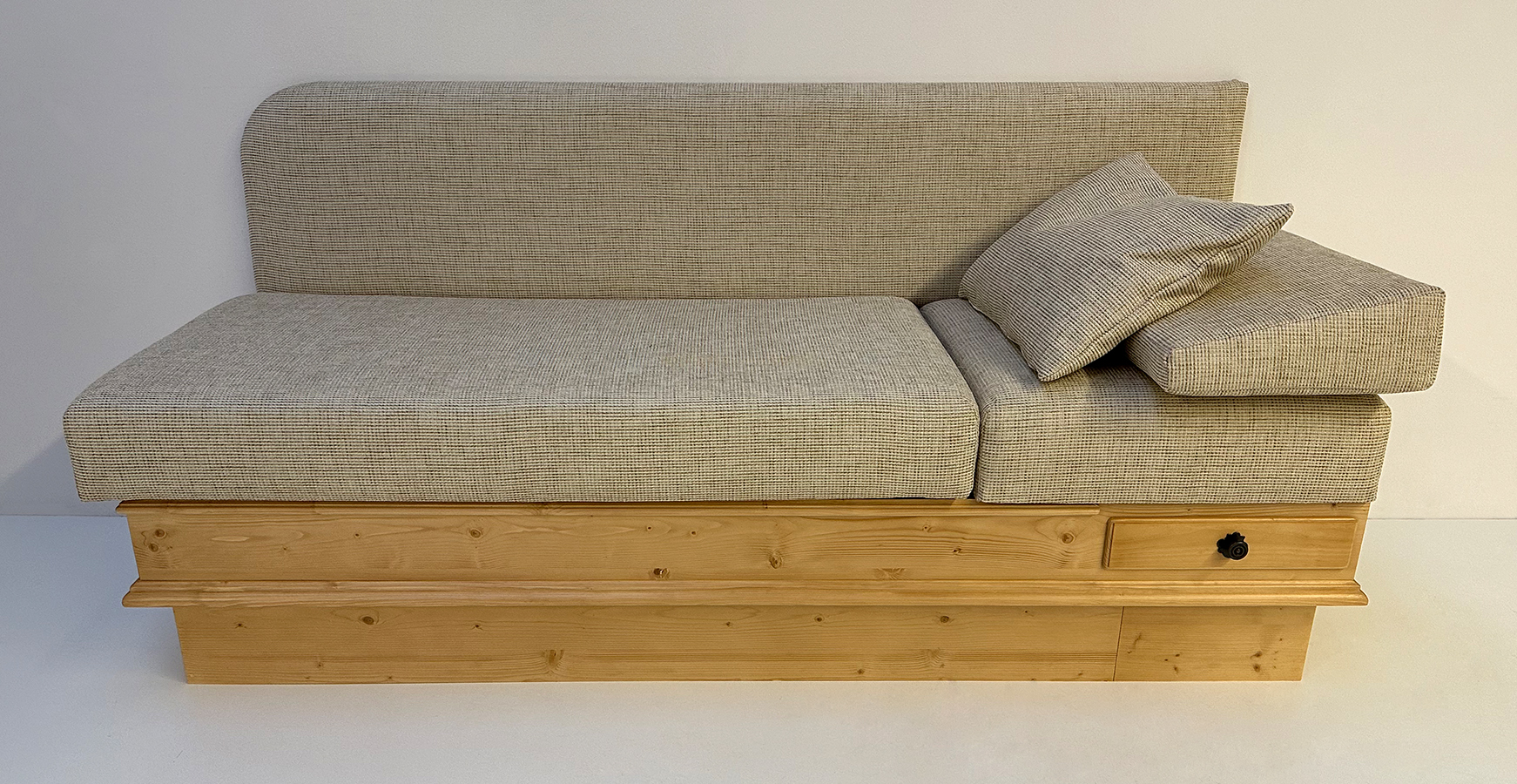 Länge 195 cm, Rücken gerade, Sitz aufklappbar, Kopfteil gerade fest, mit Lehnenkeil aufgesetzt