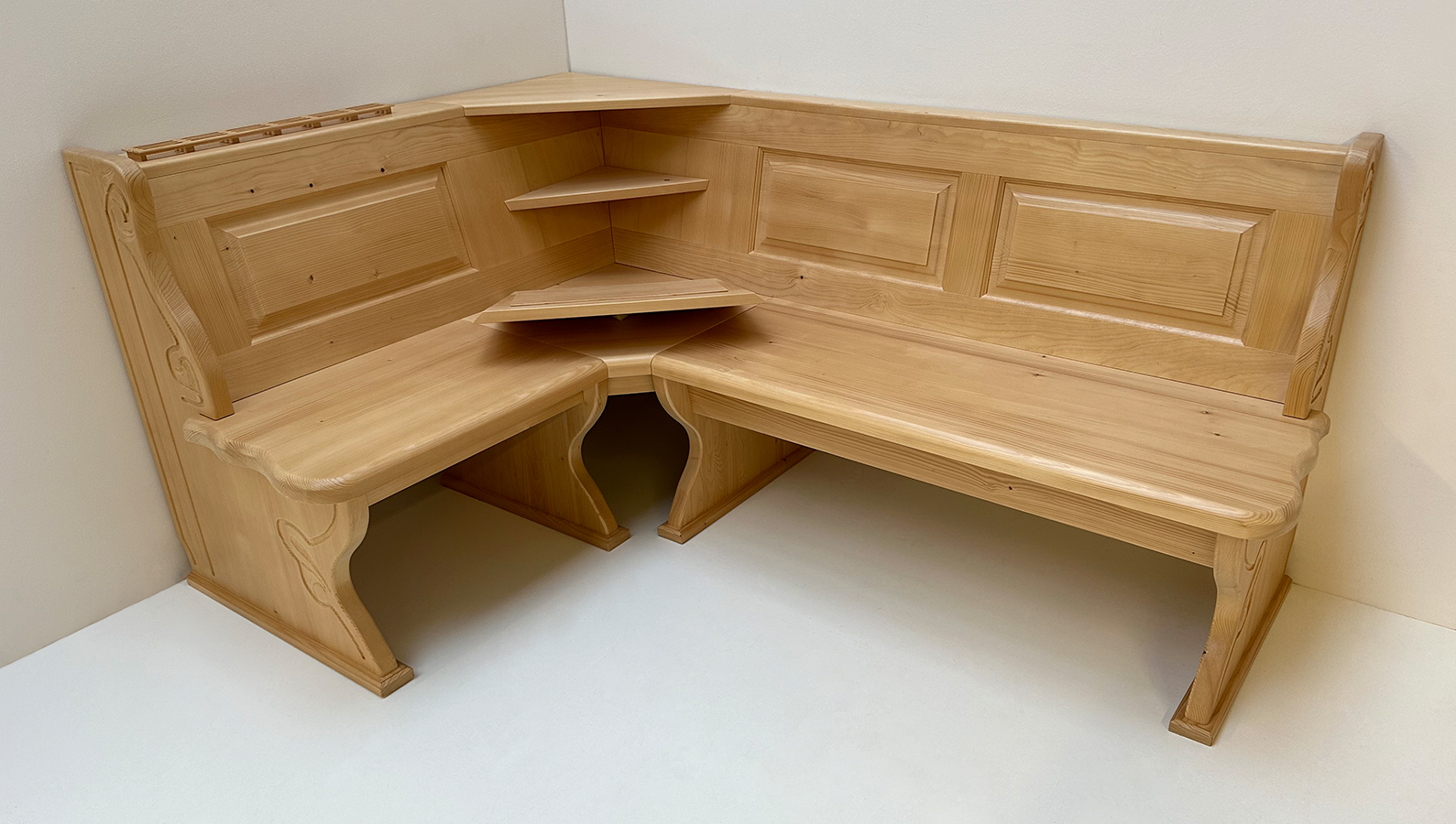 1 Eckbank Lindau Schenkelmaße 130/195 cm Ecke 45 grad, Rücken mit Kassetten, Außenwangen geschnitzt