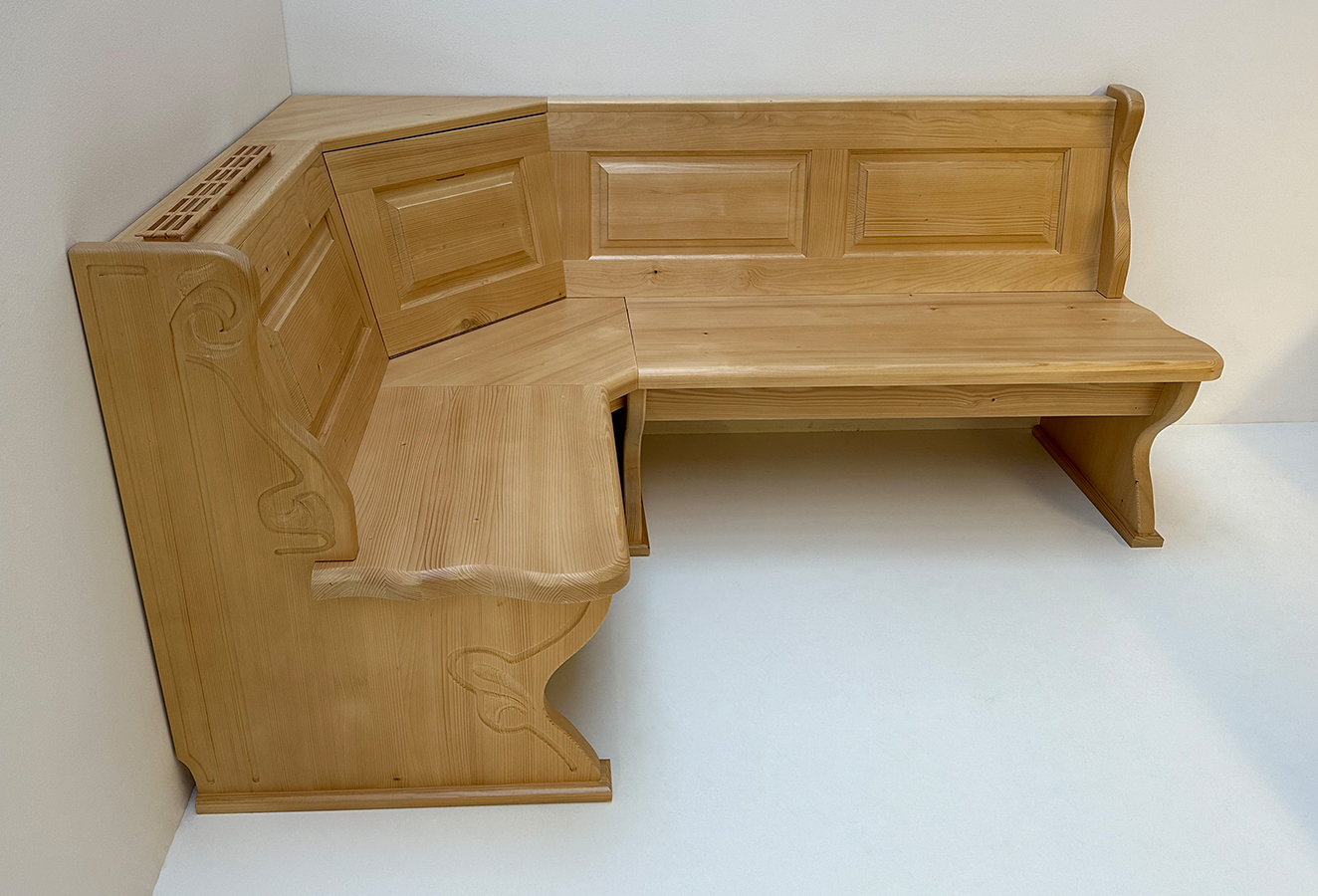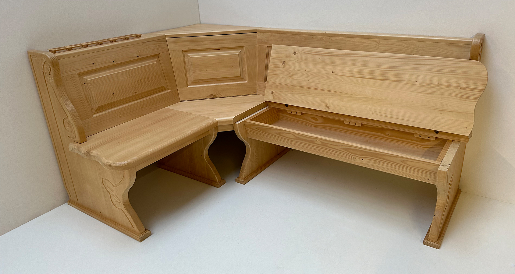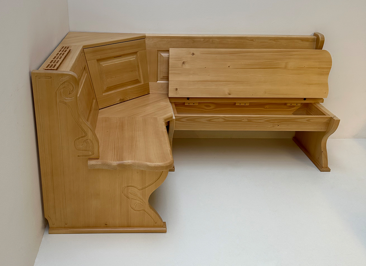 Eckbank Lindau 130/195 cm, Truhen, Wangen geschnitzt, Ablagenverbreiterungen, Ecke aufklappbar