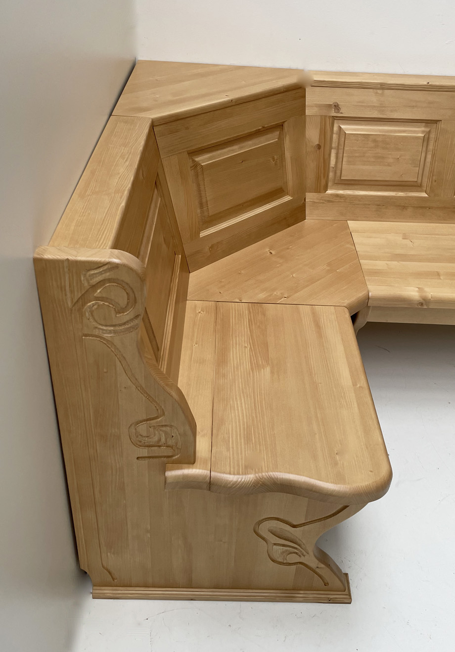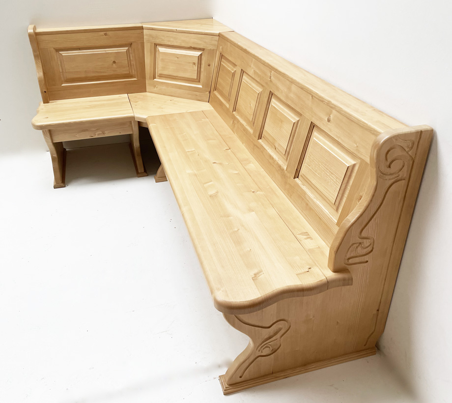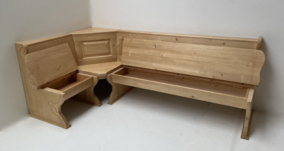 Eckbank Lindau 130/240 cm, Aussenwangen geschnitzt, Truhen aufklappbar, Ablagen Sonderbreite 10 cm