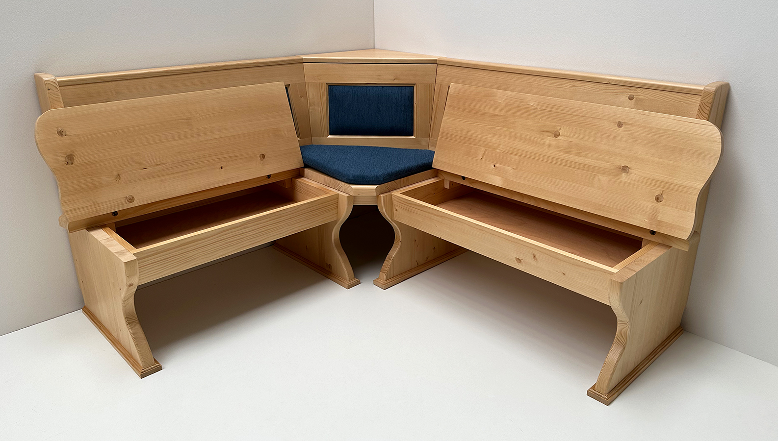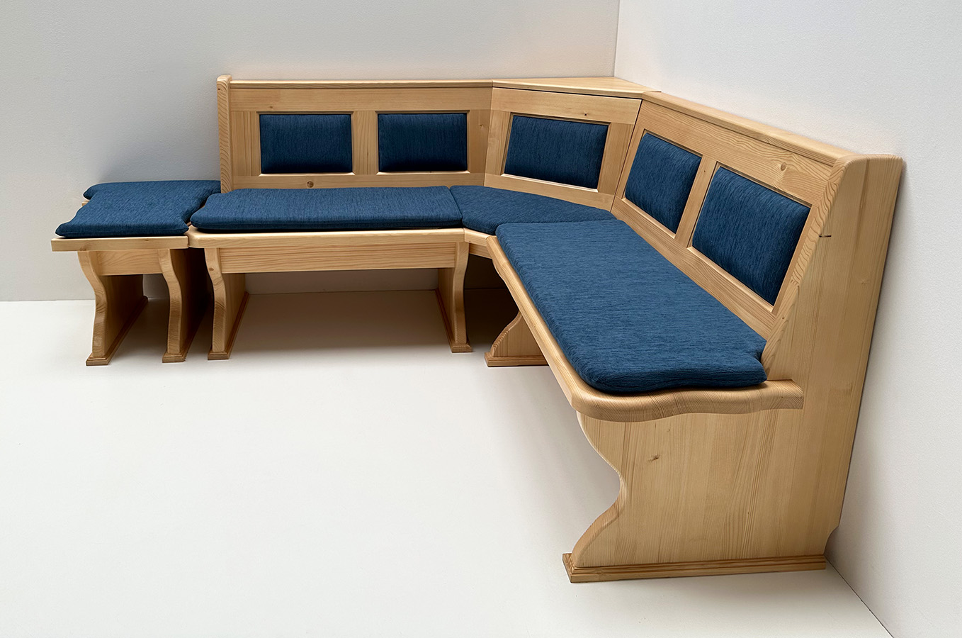 Eckbank Lindau 150/165 cm, Ecke aufklapp. XXL-Truhen, Polsterkasetten, Anstellhocker, Landshut blau