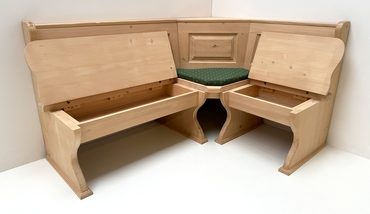 Eckbank Lindau 165/125 mit Truhen, Rosner gewachst, Polster lose genäht, Kundl grün