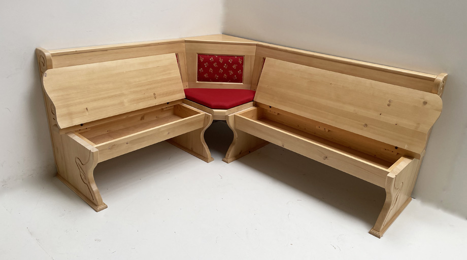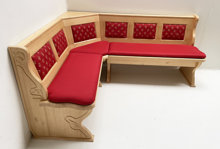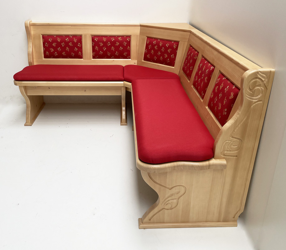 Eckbank Lindau 165/195 mit Truhen, Aussenwangen geschnitzt, Polsterkasetten, Polsterplatte MSBM rot