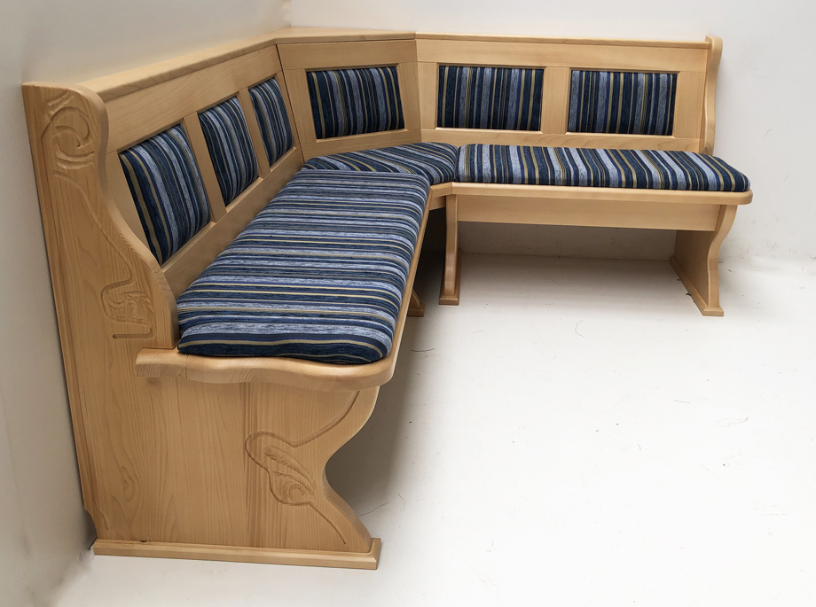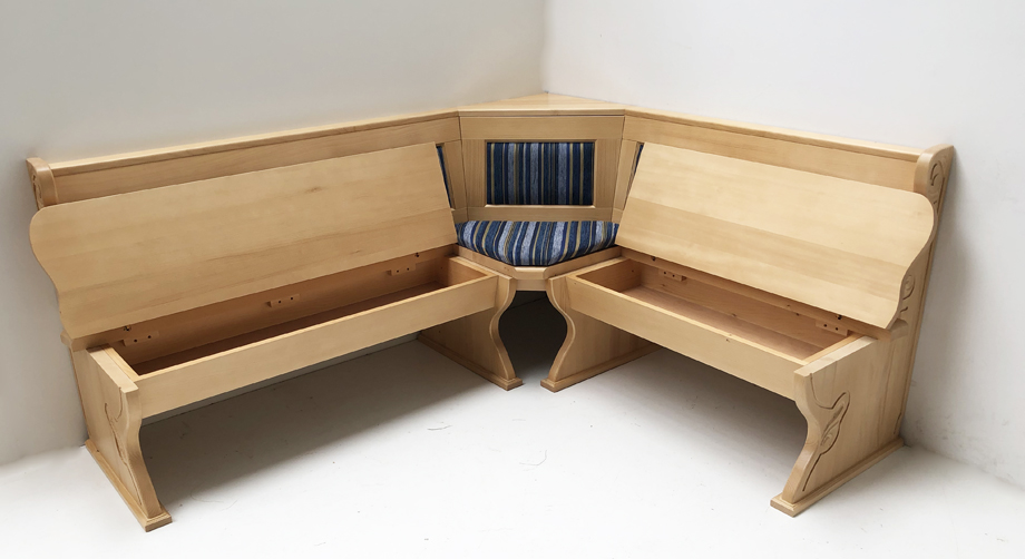1 Eckbank Lindau, Schenkelmaß Stellmaß B>195/165 cm, mit Truhen, Ecke aufklappbar, Ablagenhöhe 87 cm, Wangenhöhe 89 cm, Aussenwangen geschnitzt