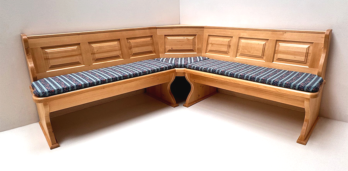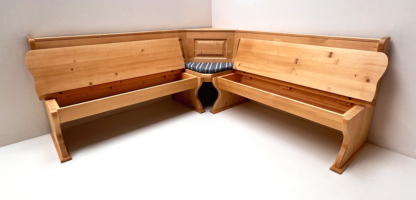 1 Eckbank im Schenkelmaß 195/195 cm, mit Truhen, Außenwangen glatt (auch in geschnitzt oder gerillt möglich !)