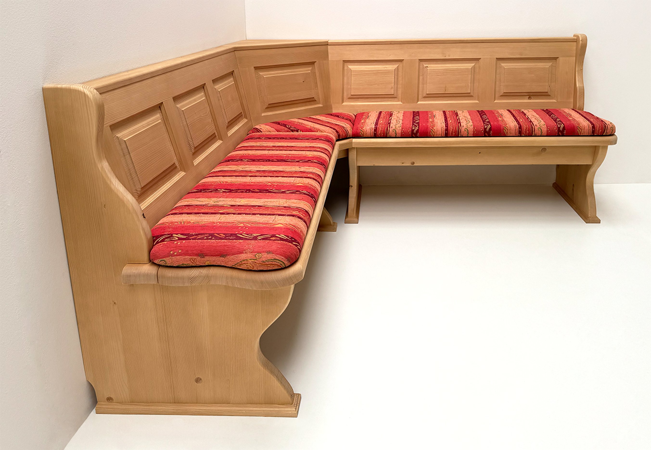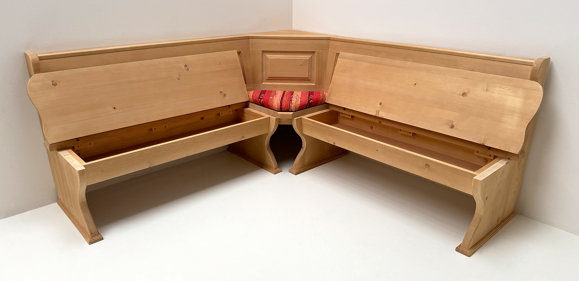 1 Eckbank im Schenkelmaß 195/195 cm, mit Truhen, Aussenwangen glatt