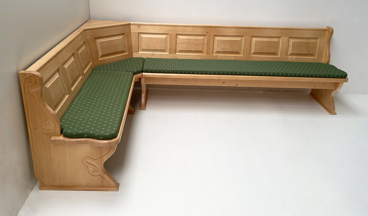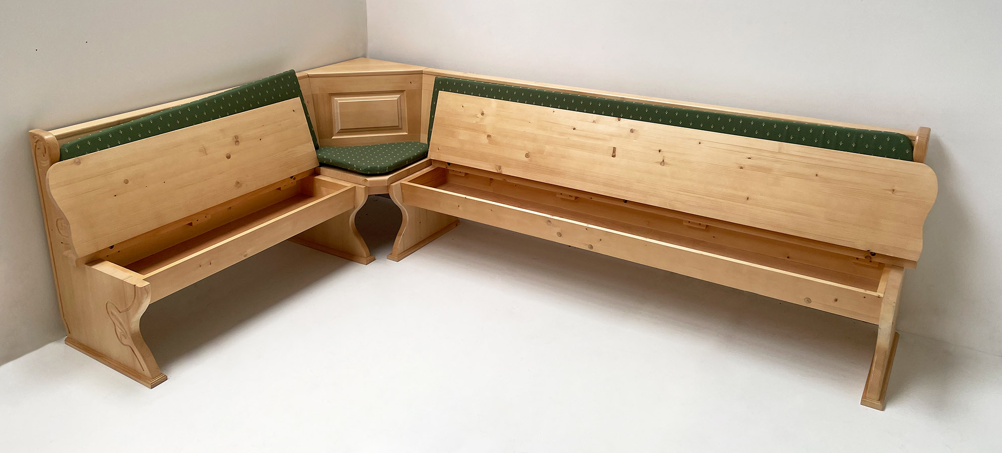 Eckbank Lindau 195/240 , mit Truhen, Aussenwangen geschnitzt, Polstersatz genäht, Kundl grün