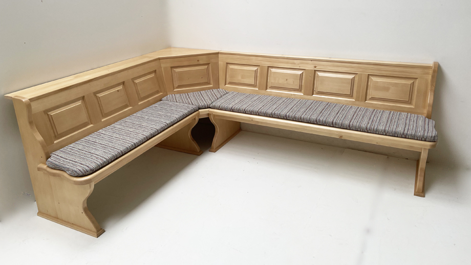 1 Eckbank Lindau, Stellmaß A> Gesamtmaß 195/260 cm, ohne Truhen, Fichte massiv, Ablagenhöhe 87 cm, Wangenhöhe 89