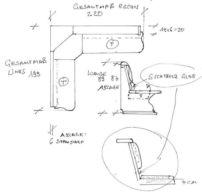 Links Ablage Standard 6 cm, rechts verbreitert auf insgesamt 20 cm , rechts