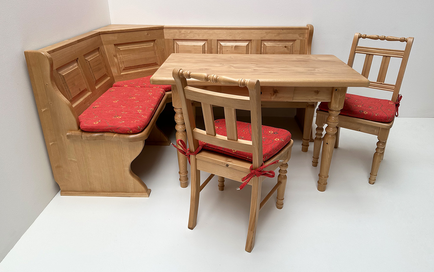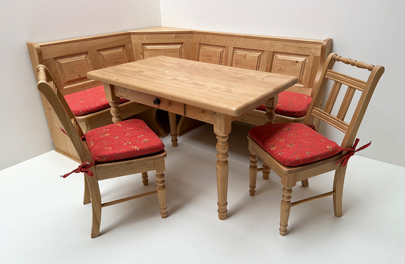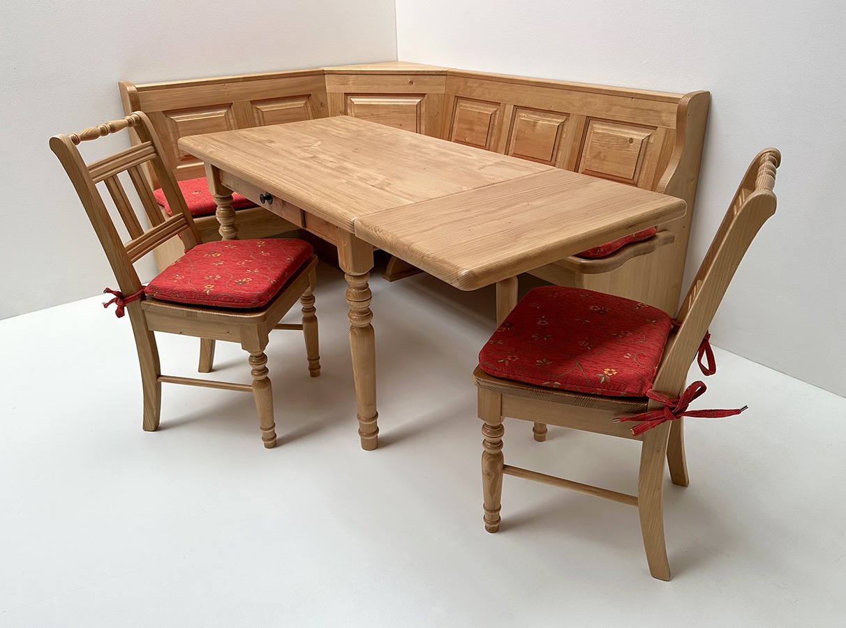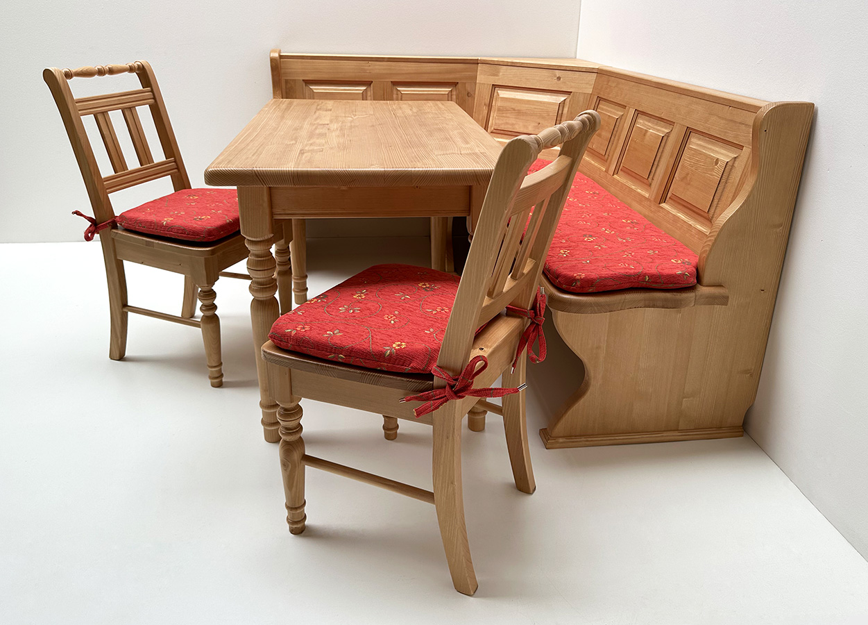 Eckbankgruppe LINDAU 145/185 Fichte, Tisch 4135, 110/70 cm, Stühle 3140, Polster Pöchlarn Ranke rot