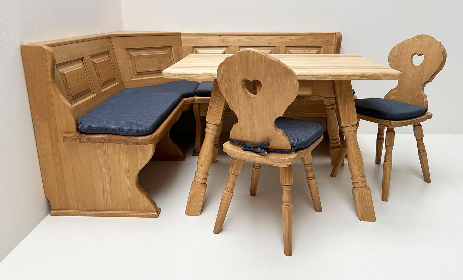Eckbankgruppe LINDAU 150/185 Fichte, Tisch 4510-Amberg, Stuhl Munich, Armlehnstuhl Munich, Polster
