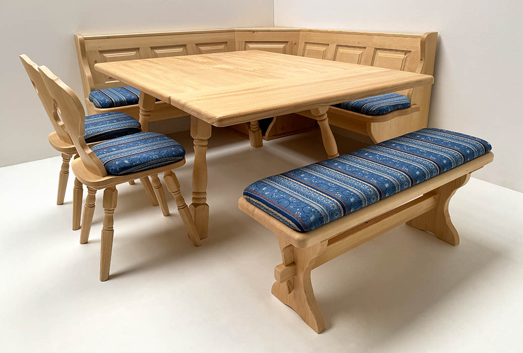 Eckbankgruppe LINDAU 185/185 cm, Tisch 4510-Amberg, Stuhl Munich gedrechselt, Polster genäht TS-7758