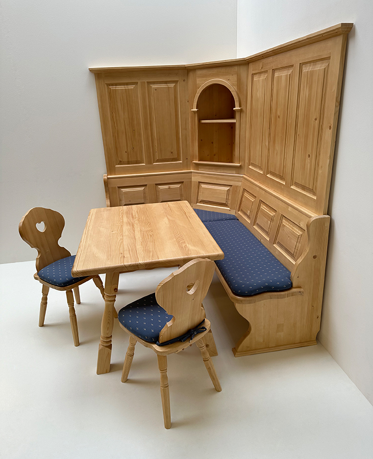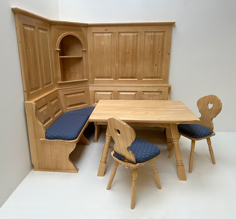 Eckbankgruppe Lindau 145/195cm, Truhen, Wandverkleidung, Tisch 85/120 cm, Stühle Munich, Kundl blau
