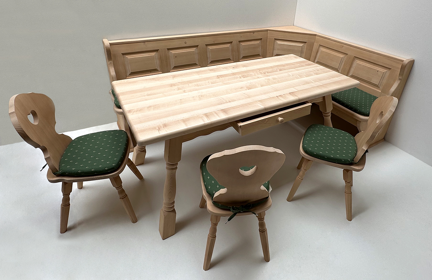 Eckbankgruppe Lindau, Fichte massiv: Rosner gewachst, Tischplatte Ahorn natur lackiert