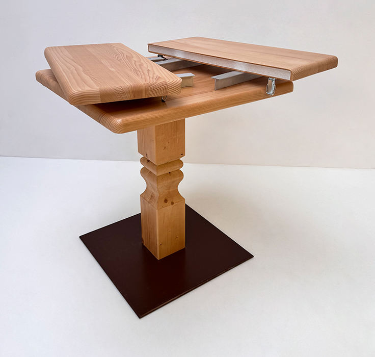 Klostertisch Mittelsäulen-Tisch, Fußscheibe Metall, Fichteplatte 70/70 cm mit 2 Ansteckplatten 30 cm