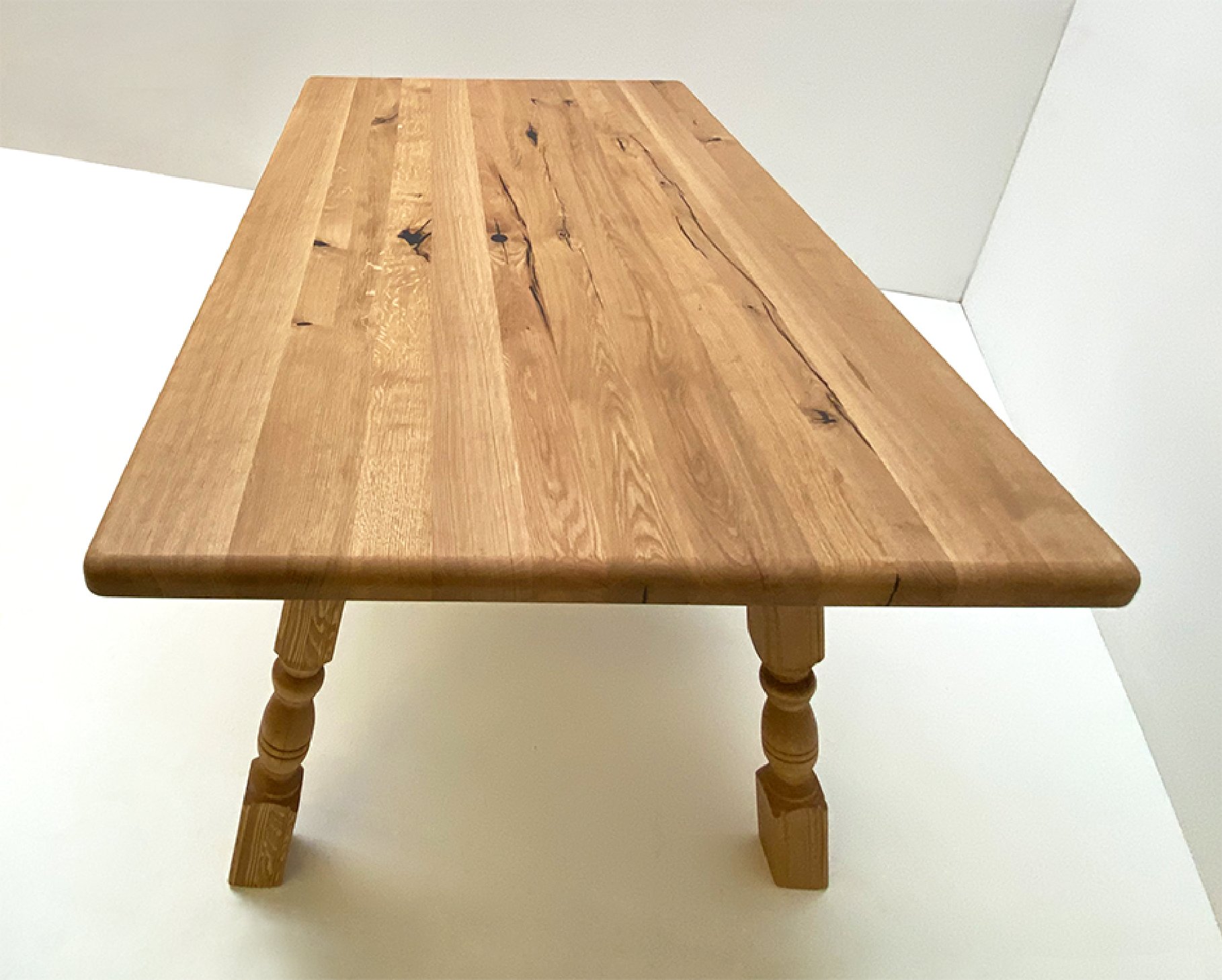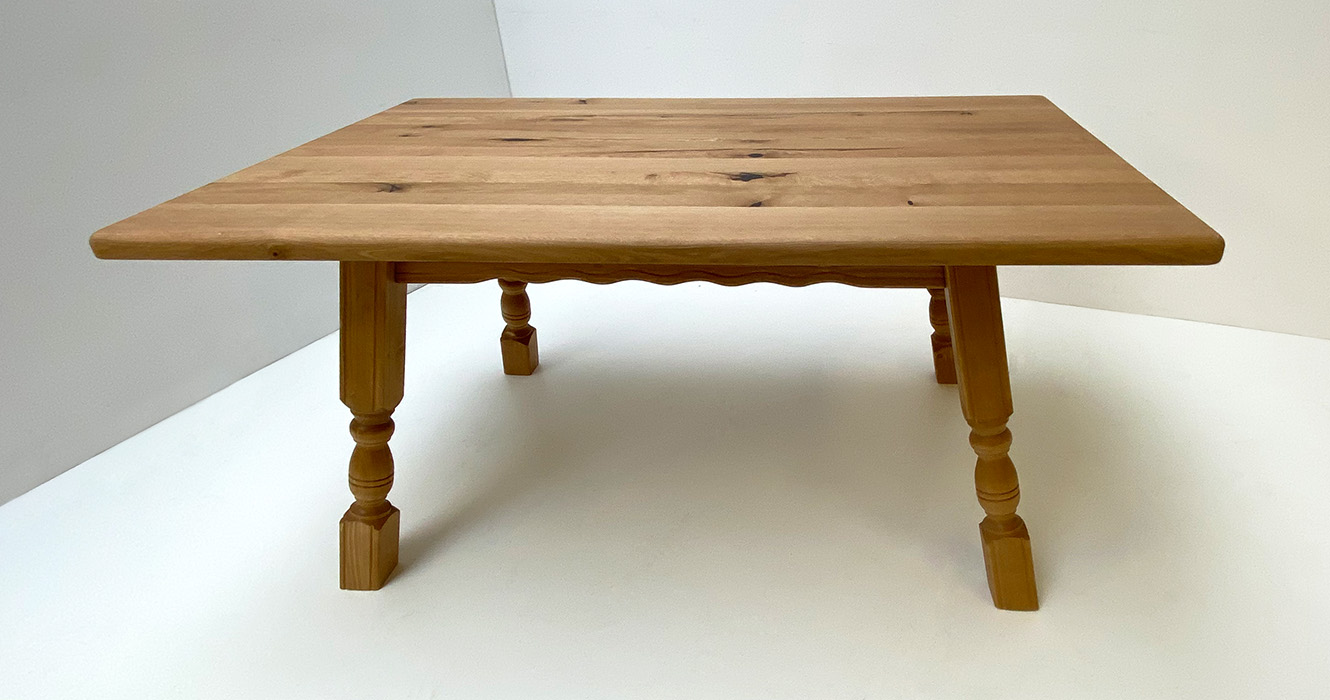 Tisch 4510 mit gedrechselten Beinen, Gestell in Fichte, Kleur 2 Antik dunkel lackiert, ohne Schubladen, Abm. 100/160 cm, massive Tischplatte in Wildeiche geölt