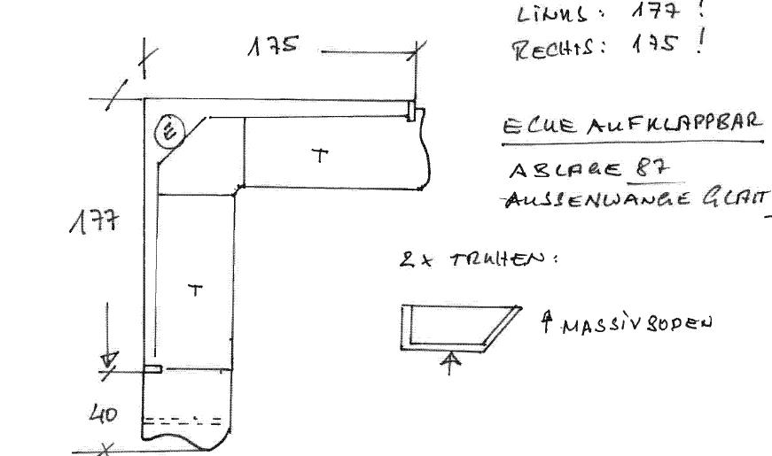 Wangenmaß rechts 175 cm, 1 Freisitz links 40 cm Anbauteil mit Fuge zur Truhe
