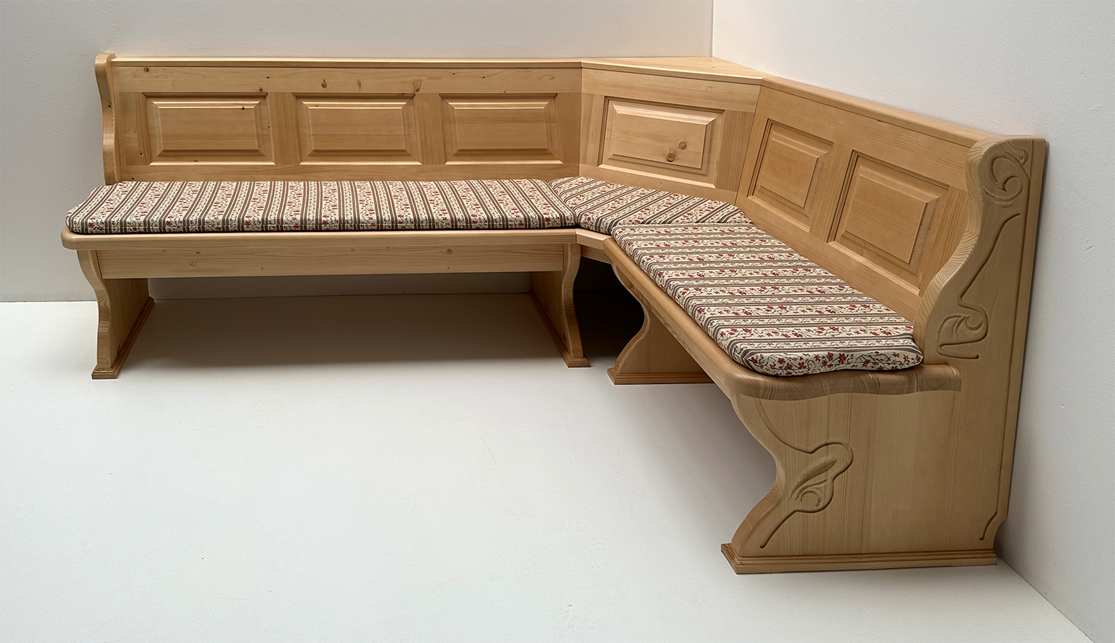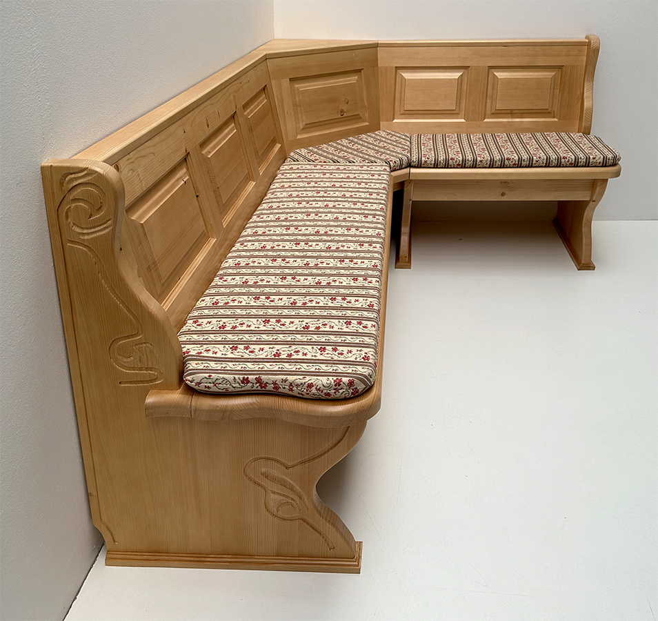 1 Eckbank Lindau ohne Truhen, gerade Kassetten, Stellmaß B >215/150 cm, Sitz- und Wangenstärke 4 cm, gerade Holzkassetten