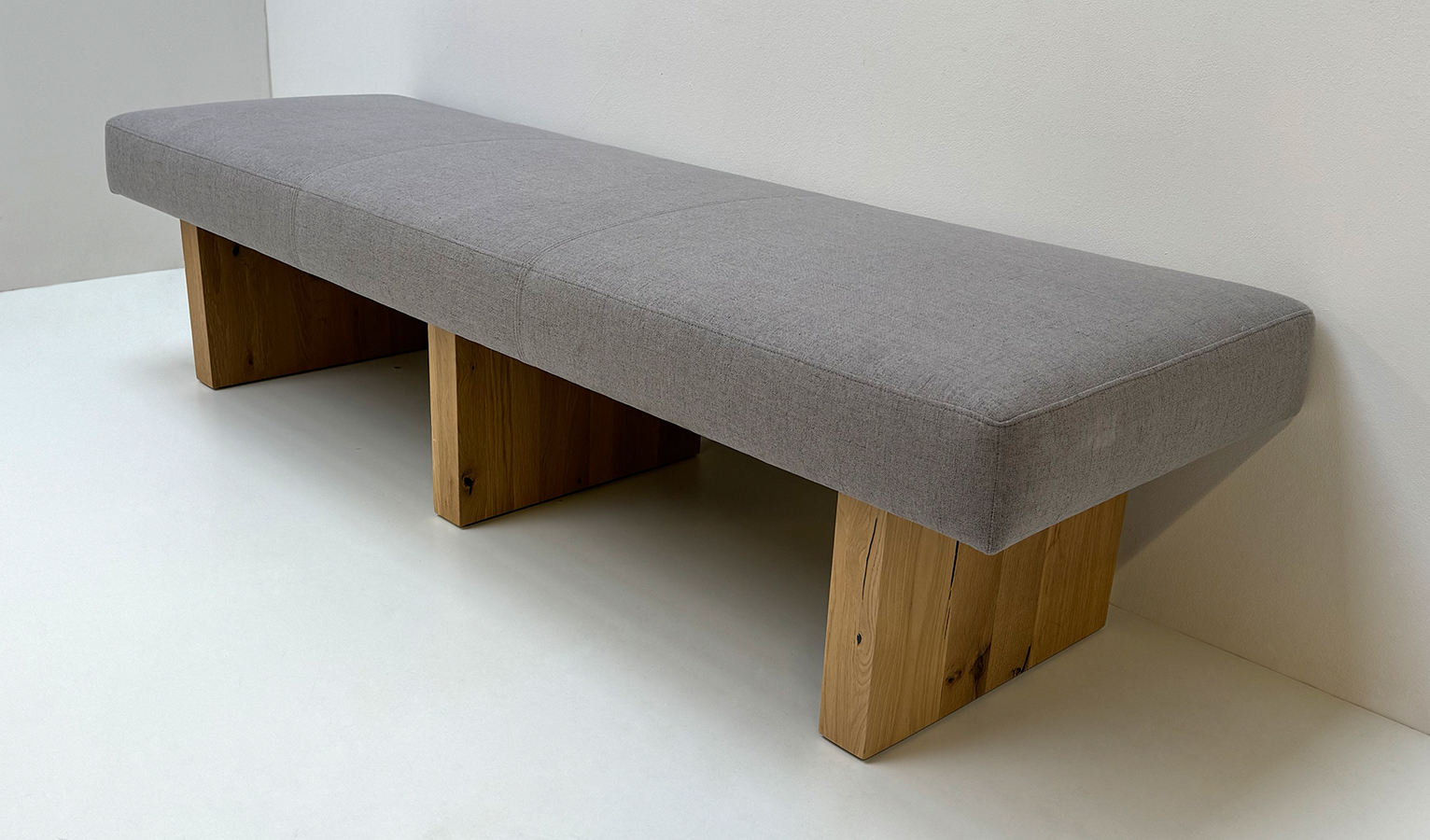 Vorbank SUMMER Vollpolster Massivholzbank, Vorbank 200 cm, Wildeiche lackiert, Bezug Grau 9502 Stoff