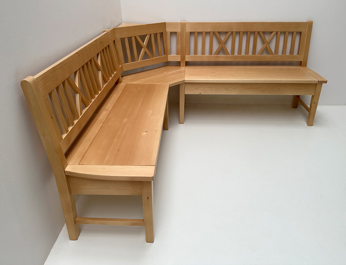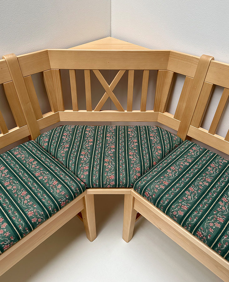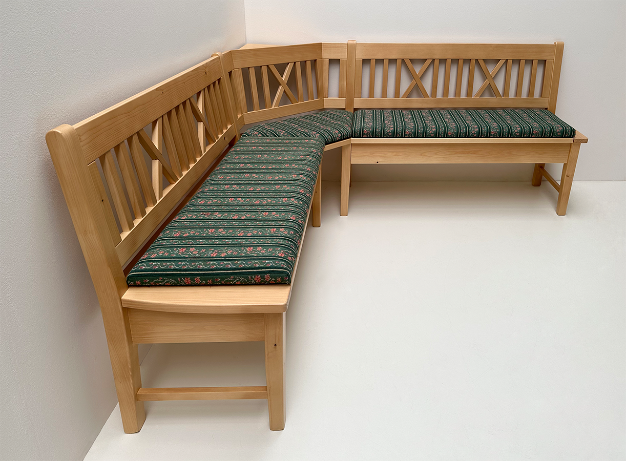 Eckbank Nürnberg 190/190 cm mit Sprossen, Rosner lackiert, Polsterplatte Waidhaus grün